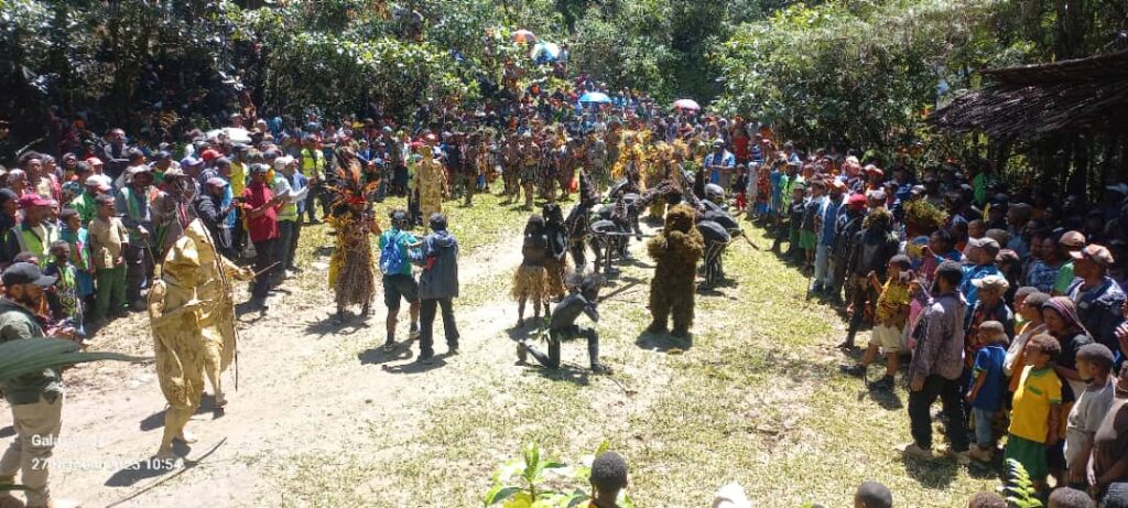 The scenic remote highland village of Hogave is surrounded by pristine rainforest vegetation and is located 63 kilometers (three hours’ drive) out of Goroka Town in Lufa District. It is situated at the south west foothills of Mt Michael (Aumoi) which is the highest mountain in E.H.P and the fifth highest mount in PNG at 3637 meters. The public road that runs through the forest, to the vast population beyond, serves as a boundary for the pristine high altitude forest which hosts the magnificent Lowes Parotia (Kiaga), the McGregor’s Bower Bird (Ose) and 11 other birds of paradise. About 3 kilometres vertically below the forest edge perches Hogave village. Further down beyond the village, is the gardening area and beyond that where the climate is hot, there is an extended forest area beside the intense Tua river (where it meets the Whagi). There resides the Raggiana Bird of Paradise, short beaked Echidna, Cuscus and countless intriguing creatures. The forest itself boasts many tree and plant species. Hogave village or tribe is made up of the Laivolo, Mula and Kevoma clans comprising of village elders, men, women, children and youth. The Hogave people are rich in culture and heritage and are proud custodians of the Hogave forest.